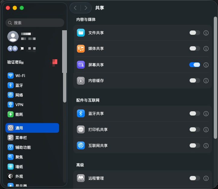 在系统设置左侧边栏中,找到并点击 通用 → 共享,你将看到如下共享服务列表: